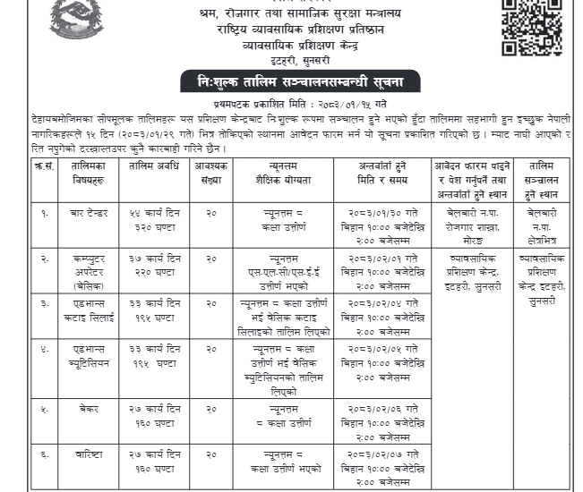 काठमाडाैं । श्रम, रोजगार तथा सामाजिक सुरक्षा मन्त्रालय अन्तर्गतको व्यावसायिक प्रशिक्षण केन्द्र, इटहरीले १२० जना नेपाली नागरिकलाई विभिन्न सीपमूलक तालिम निःशुल्क प्रदान गर्ने भएको छ ।